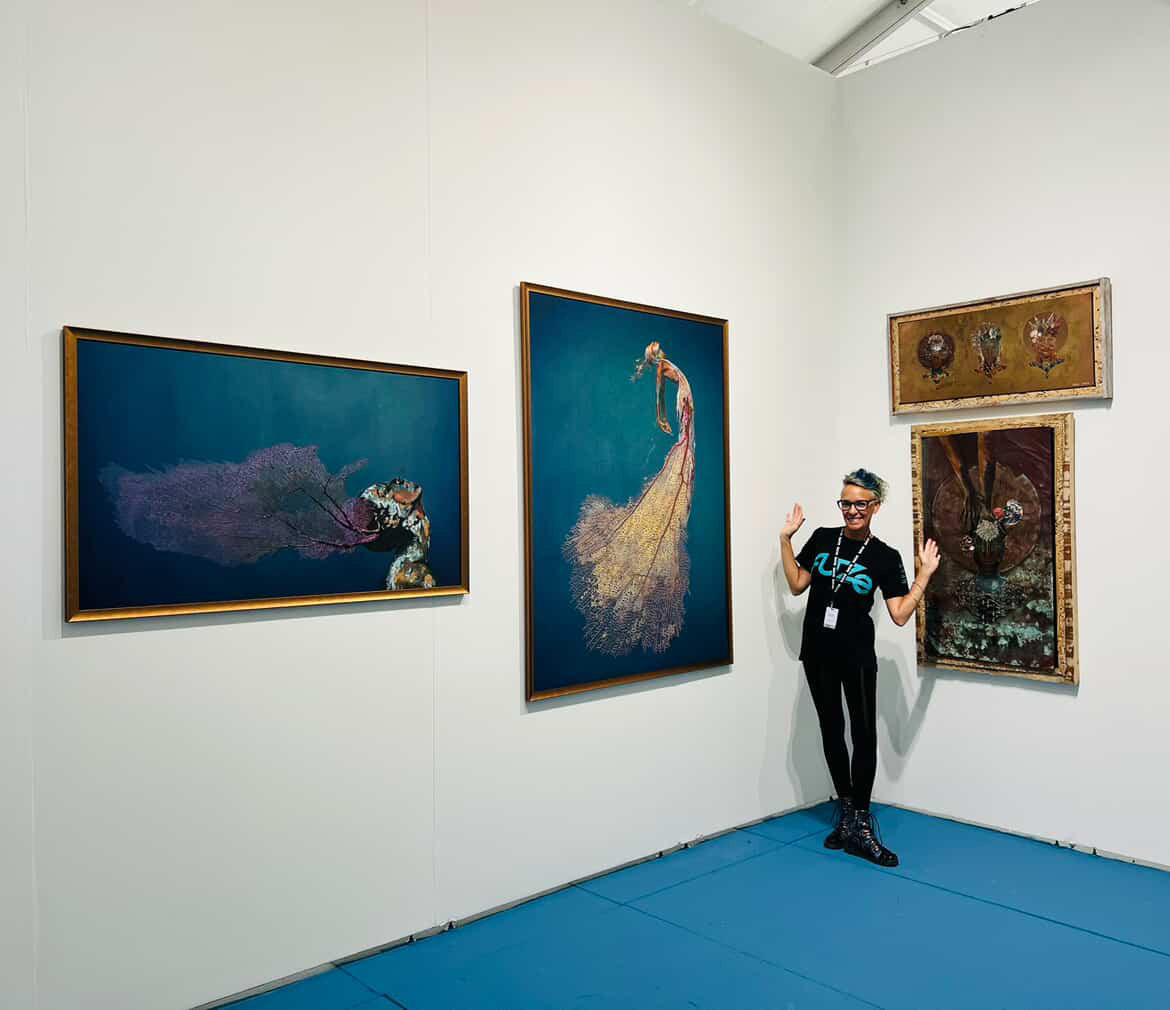 In a brief conversation with Dede Brown you get the sense that she’s exactly where she’s supposed to be. Born and raised in The Bahamas she carries that unmistakable island energy the kind that feels grounded intuitive and quietly powerful. I met her through The Blue Floor Project where she exhibited with The Current Art Gallery at SCOPE Art Fair Booth E11 at Baha Mar Resorts in Nassau and let me tell you her work doesn’t whisper it pulls you in and then gently refuses to let go 🇧🇸